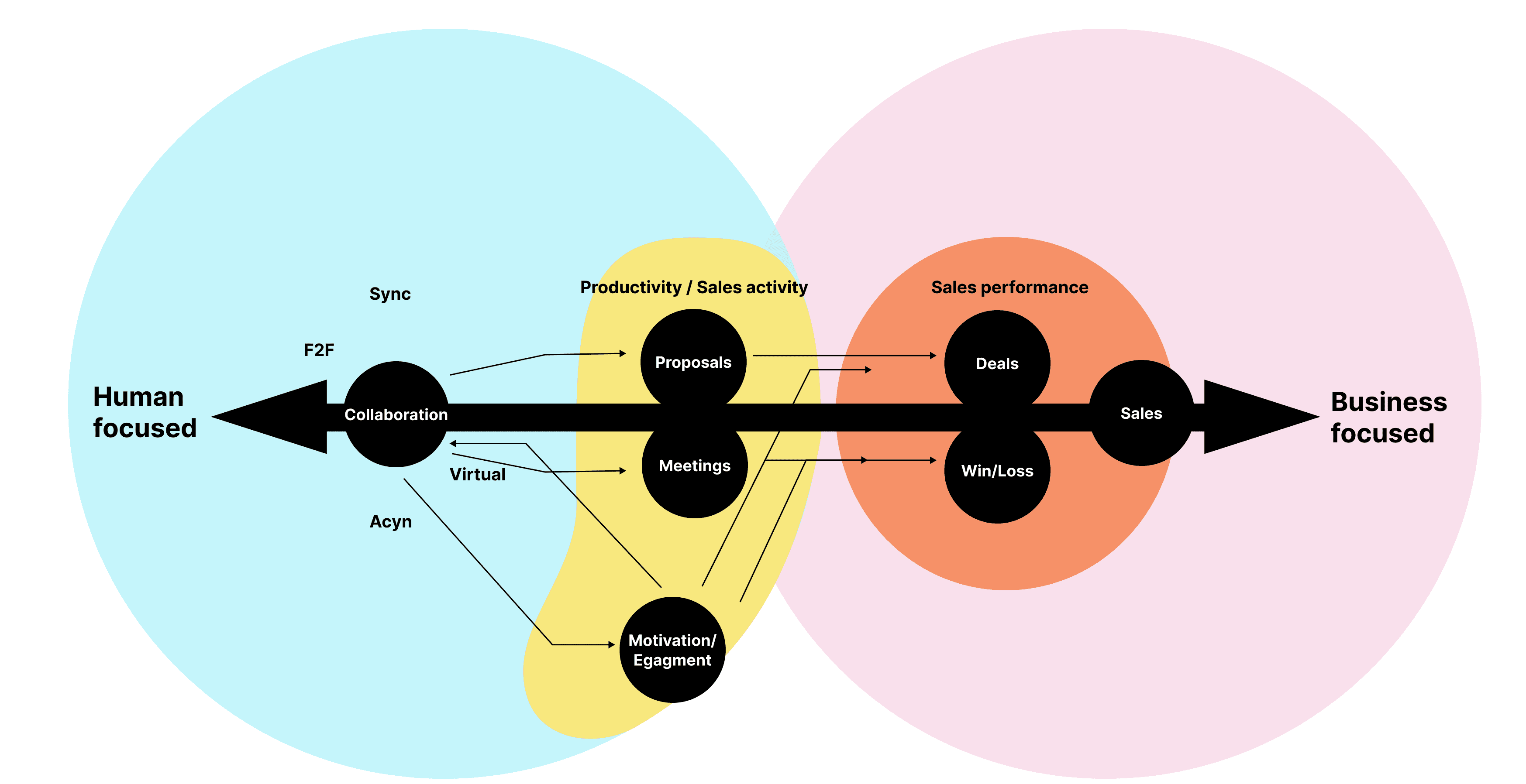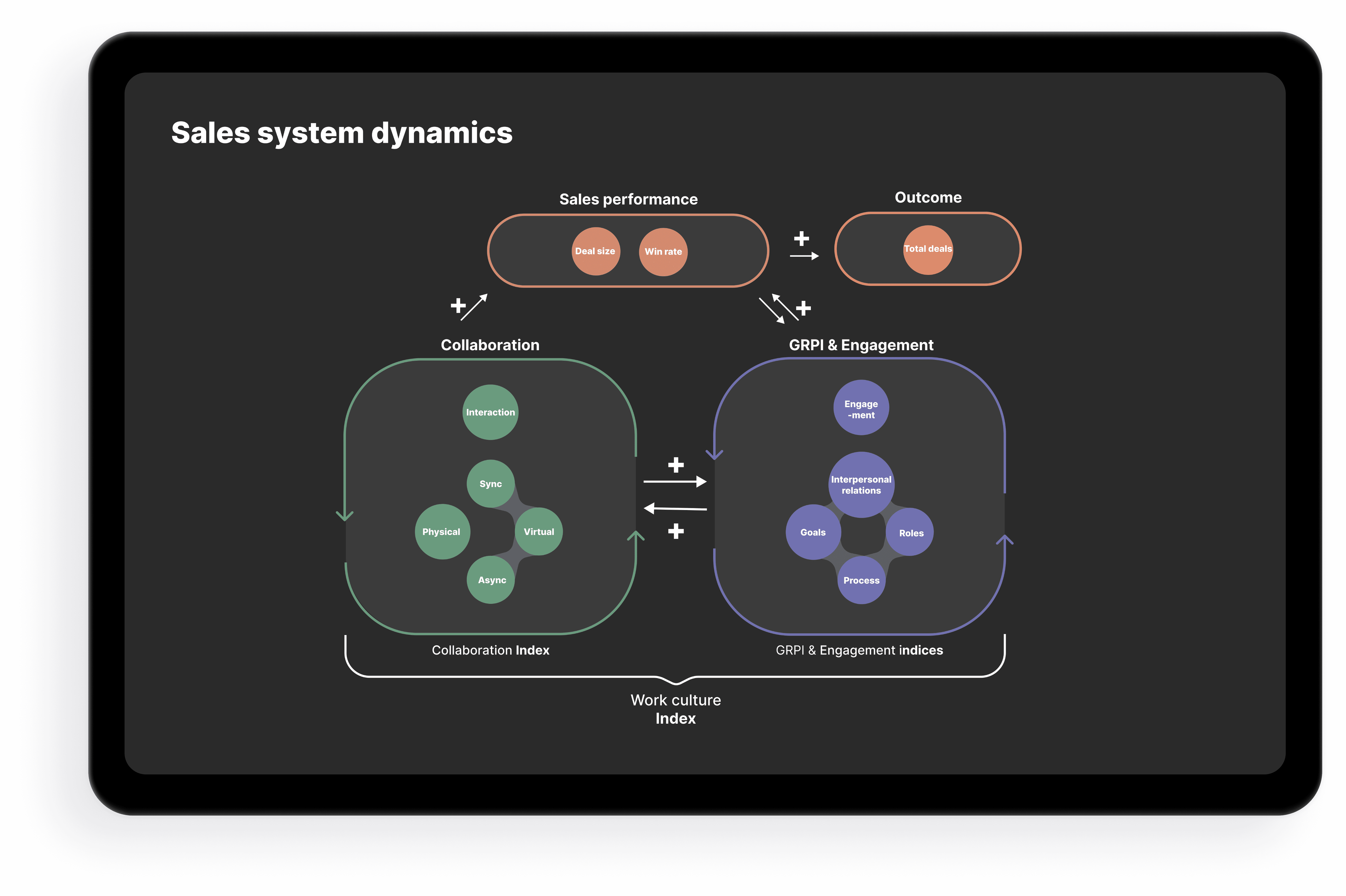 System modeling, mapping causal links between collaboration behaviors (Slack, meetings, F2F) and performance metrics (win rate, deal size)
